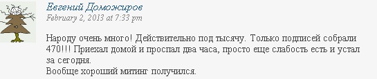 У правой руки Евгения Доможирова – Ларисы Трубицыной – по всей видимости, немного более скромные аппетиты. Она утверждает, что на митинг собралось порядка 800 человек. «Учредительная конференция Регионального отделения Всероссийской политической партии “Народный Альянс” в Вологодской области состоялась. В полном составе партийцы и гости приняли участие в гражданском митинге, который собрал сегодня в Вологде 800 человек», — пишет Лариса, но уже в следующей публикации опровергает саму себя: «Митинг в Вологде 2 февраля был прекрасен. Почти 1000 вологжан пришли, чтобы прекратить грабеж на вологодской штрафстоянке».